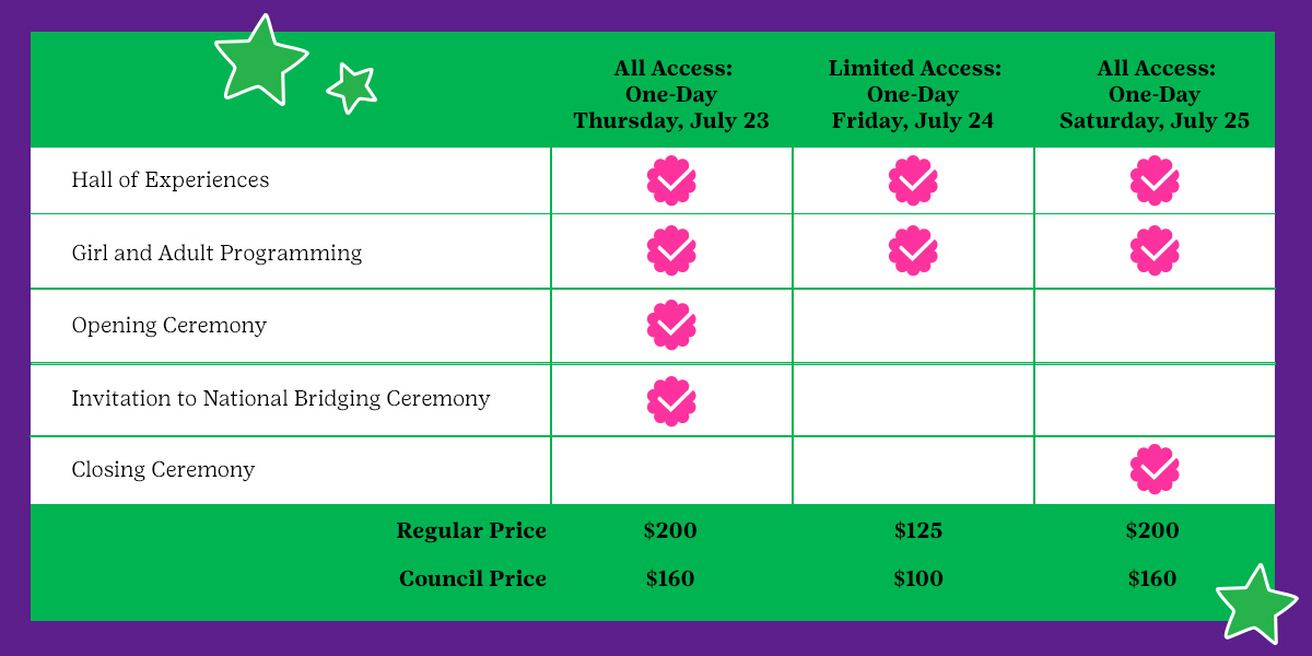 | Exciting news! As the host council, Nation’s Capital has secured a limited number of 1-day tickets to the Girl Scouts Unite event in Washington, DC, from July 23–25, 2026. This is your chance to experience all the excitement of the event for a single day. Plus, Nation’s Capital members save 20%* on 1-day tickets. The price and what’s included with your 1-day ticket depends on which day you attend the event (see chart below):  At the Girl Scouts Unite event, you'll hear from inspiring speakers like Space Gal Emily Calandrelli, explore 100+ booths and activities in the Hall of Experiences, and participate in interactive skill-building workshops for adults and girls in grades four and above. Together, we'll make friends, make memories, and make a difference as we celebrate all the ways that Girls Make History. Don’t miss out—choose a date and join us! For more details on what is planned each day, visit the event site. Location: Walter E. Washington Convention Center 801 Allen Y. Lew Place NW Washington, DC 20001 Available One-Day Ticket Dates: Please Note: Tickets are available on a first-come, first-served basis. One-day tickets are limited to one ticket per person. You must select between Thursday, Friday, or Saturday entry; you will not be able to combine one-day tickets to attend multiple days. Children four years old and under are free; but they must be registered and require a ticket. Questions? Contact us at councilcare@gscnc.org. |